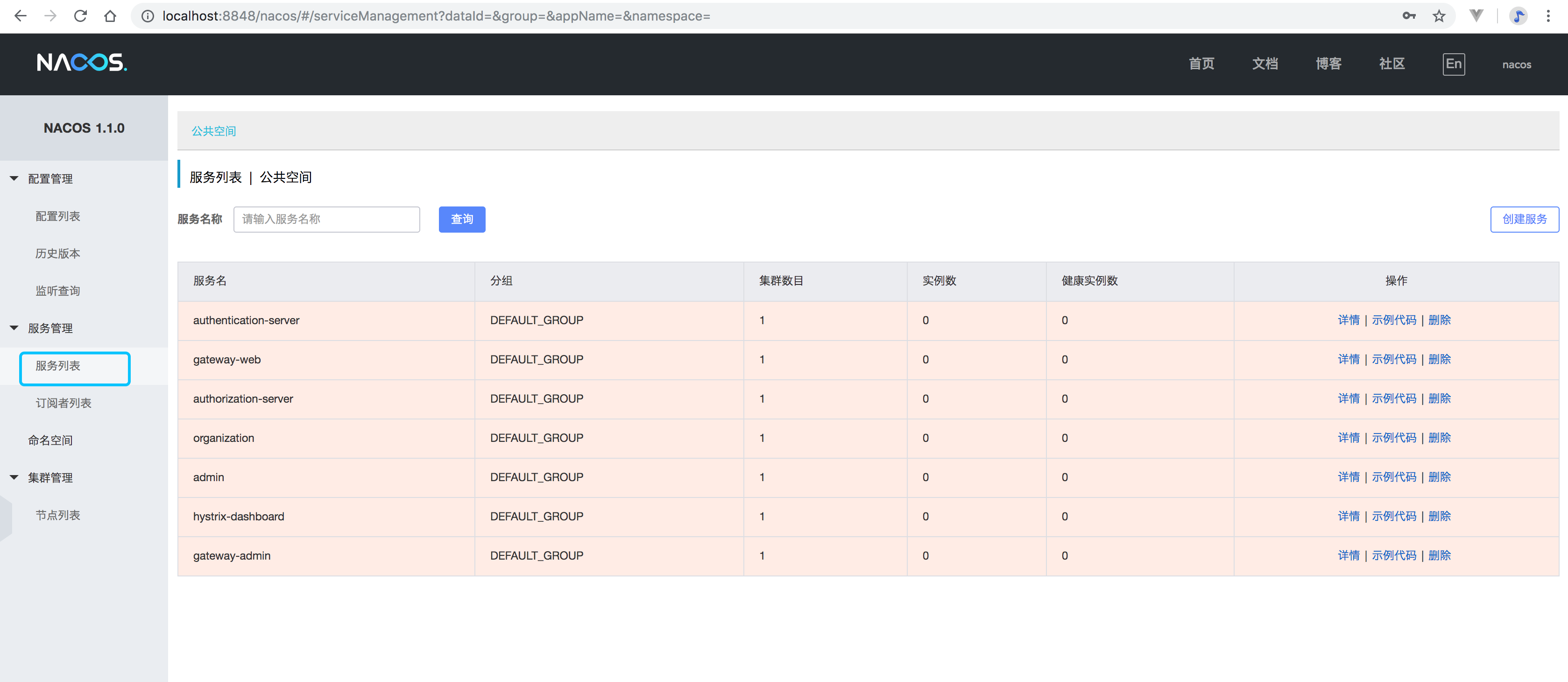 浏览器中打开http://localhost:8848,可以看到注册中心的一些信息,如目前注册的应用,应用上下线的情况。